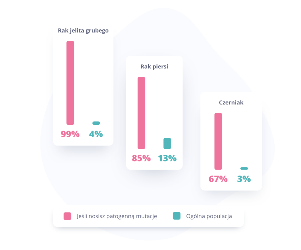Mutacja patogenna może znacznie zwiększyć ryzyko zachorowania na raka. Patogenna mutacja w genie BRCA1 zwiększą szanse zachorowania na raka piersi do 85%. W porównaniu do średniego, 13% ryzyka oznacza to 6-krotnie wyższe ryzyko.